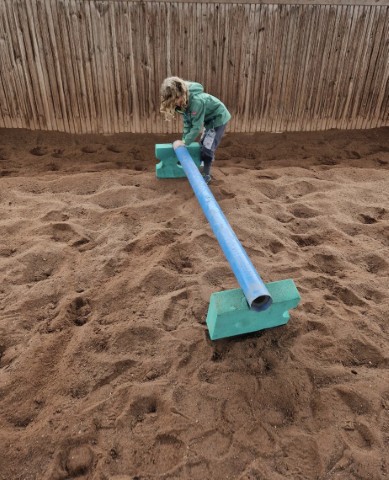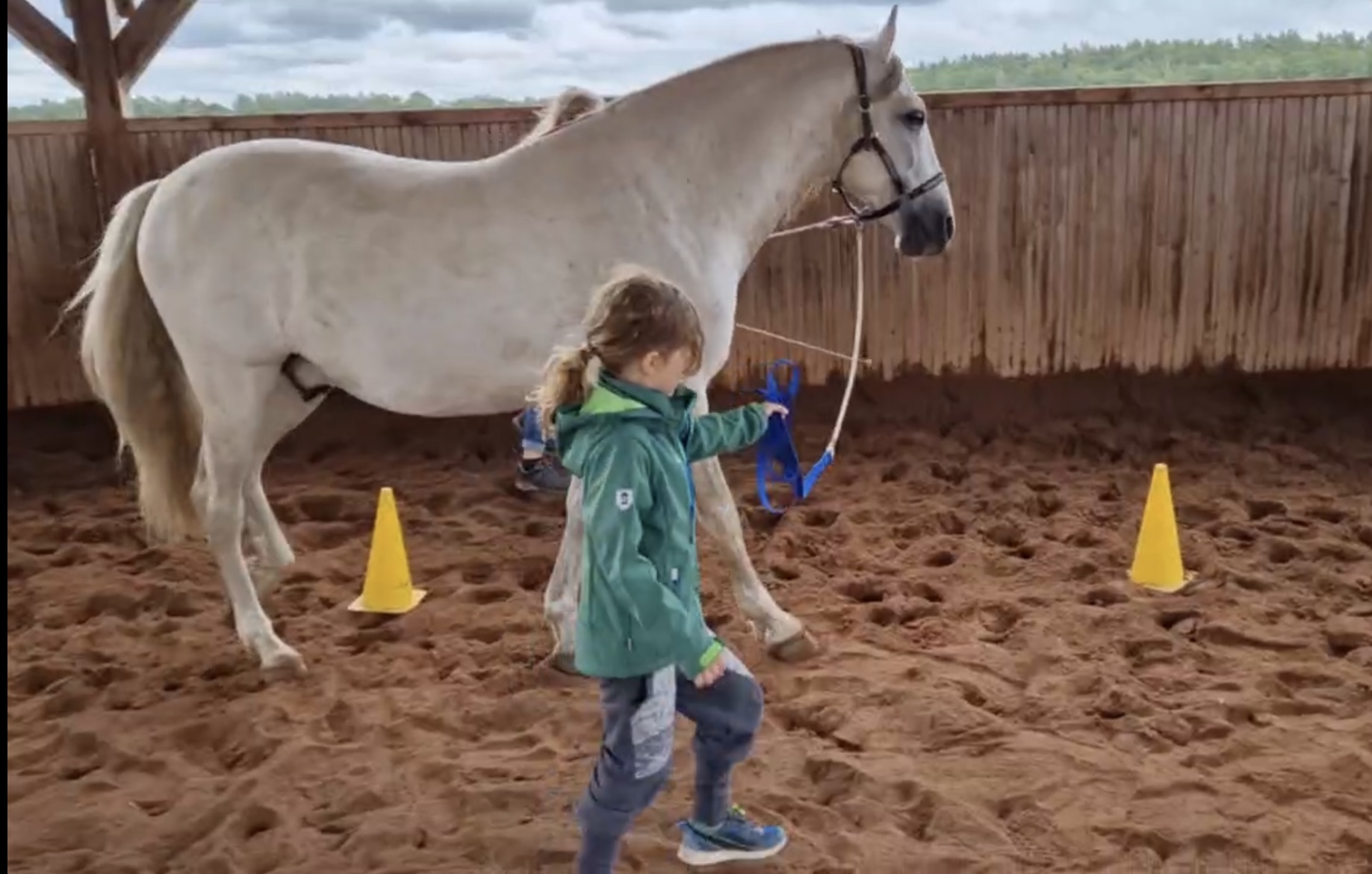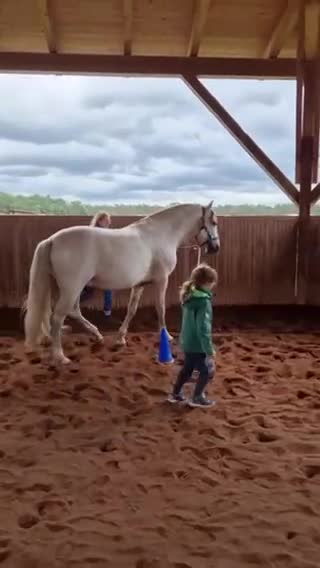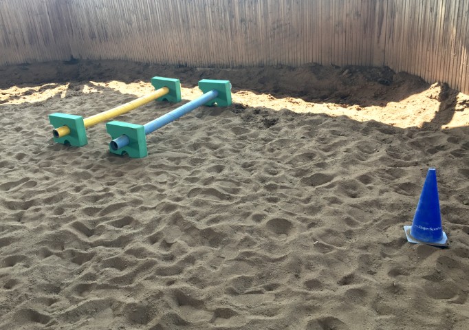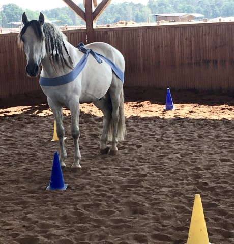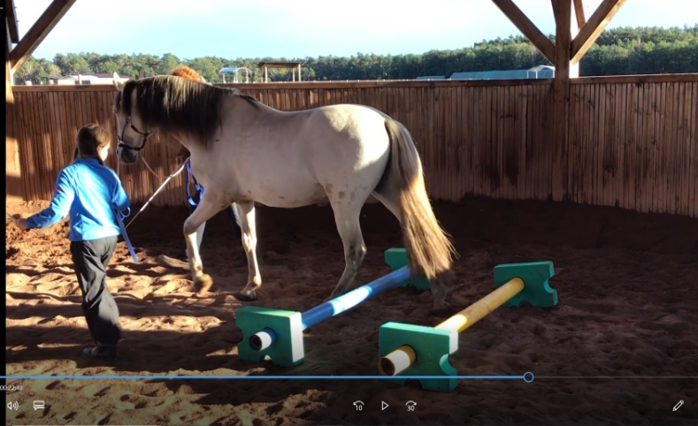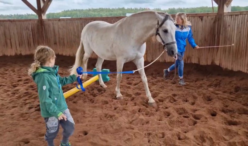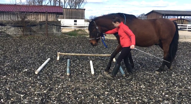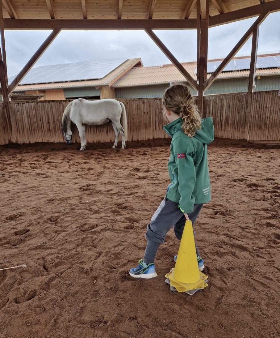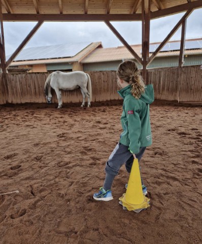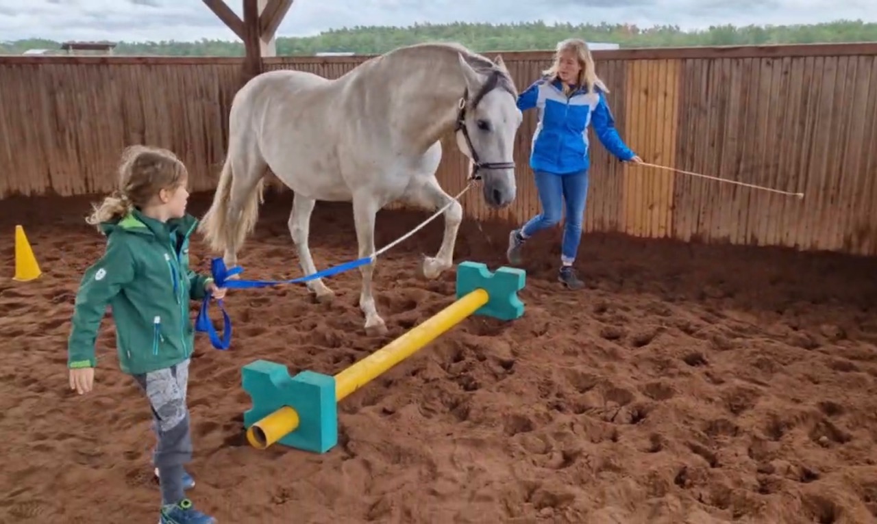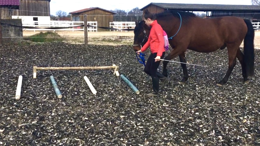 Wir arbeiten mit dem Pferd am Boden mit Führaufgaben über einfache Stangenhindernisse und durch Pylonen. Wichtig sind uns Freiraum, Bewegung und Ordnung. Das Fokussieren auf das Pferd und auf die gestellte Aufgabe ist erforderlich, da Remonte sonst einfach stehen bleiben würde. Bei dieser Arbeit wird die Wahrnehmungsfähigkeit geschult.